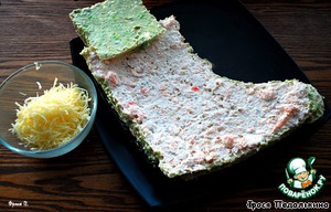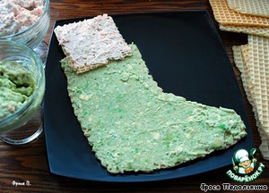 Дальше чередуем. Сапожок мажем креветками, подарок - авокадо. Так еще промазываем 2 коржа.
