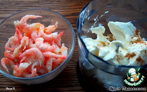 Для креветочного мусса: в блендере смешать грецкие орехи, креветки, сливочный сыр и щепотку мускатного ореха.