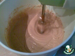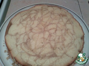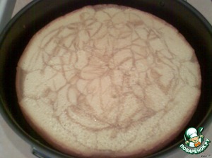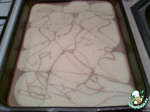 Выпекаем первый корж: в смазанную прямоугольную форму или противень вылить половину белого теста, сверху сделать паутинку из кофейного теста, выпекать в разогретой духовке 20 минут при температуре 180 градусов.