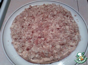 Крошку смазать кремом, сверху положить верхнюю часть круглого коржа.