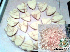 Из готового первого коржа формочкой д/печенья вырезаем сердечки, у кого нет формочки, то можно сделать шаблон сердечка из бумаги. Из оставшихся кусочков коржа сделать крошку.