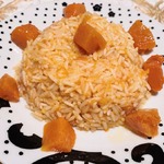 Доведите бульон до слабого кипения и держите на маленьком огне. Разогрейте в большой сковородке немного оливкового масла, всыпьте рис. Жарьте, помешивая, в течении минуты, затем влейте половник горячего бульона и перемешайте, пока вся жидкость ни впитается. Постепенно вливайте бульон и, когда останется пара-тройка половников, проверьте готовность риса: он должен быть слегка твердым внутри. Если он слишком жесткий, влейте еще немного бульона. Добавьте тыквенное пюре и оставшиеся кубики тыквы, перемешайте, приправьте по вкусу. Добавьте несколько кусочков сливочного масла и тертый пармезан. Держите ризотто теплым.