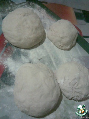 Когда тесто подошло, разделить его на 4 одинаковые части и выложить на стол, посыпанный мукой (шарики тоже присыпать мукой). -