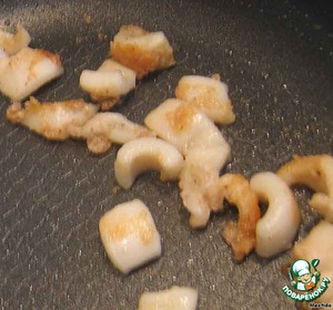 Кальмар нарезаем кусочками, солим, перчим, обжариваем в небольшом количестве масла на сковородке