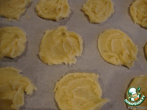 Тесто немного затвердеет. Ложечкой выкладываем тесто на противень, застеленный бумагой для выпечки. Ложечку обмакиваем в воде, чтобы выровнять тесто.