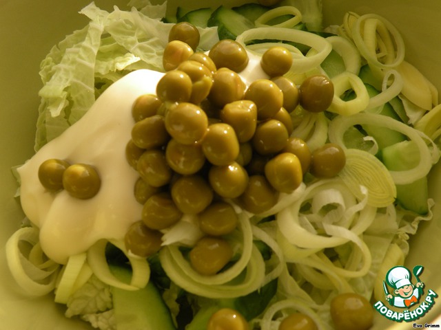 - Горошек зеленый (консервированный, "Бондюэль", маленькая банка) — 1 бан.