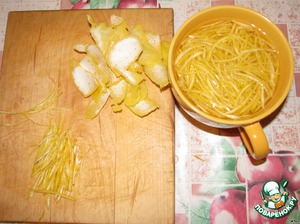 Сняв цедру, нарезаем ее соломкой и складываем в чашку с водой.