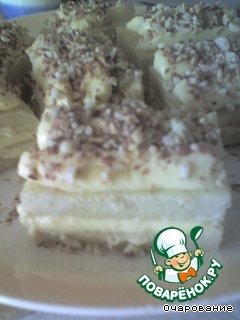 Теперь собираем пирожные: один квадрат смазываем кремом, накрываем вторым и украшаем кремом и орешками.