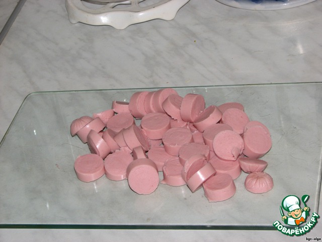 - Сосиска (можно заменить вареной колбасой или отварным мясом) — 300 г