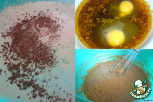 В остуженную карамельную смесь разбиваем яйца. Немного взбиваем венчиком.