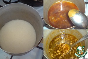 • Сахар высыпаем в кастрюльку и плавим. Как только масса станет коричневой и однородной, вливаем теплое молочко. Осторожно, не обожгитесь паром!