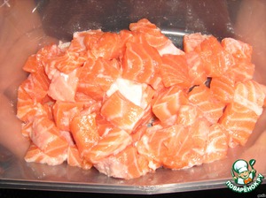 режем свежий или размороженный лосось на кубики.удаляем косточки