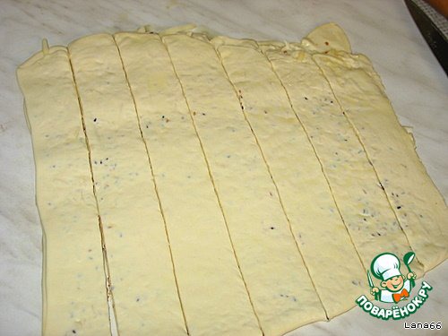 в одном направлении толщиной 4 мм и смазать взбитым яйцом. -