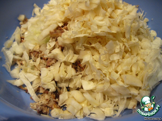Капусту мелко шинкуем и кладем в салатник.