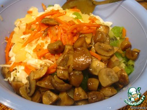 Шампиньоны поджарить до легкой румяной корочки и добавить в салат. Все составляющие хорошо перемешиваем. Солим, перчим, заправляем майонезом. Салат готов! Приятного аппетита!