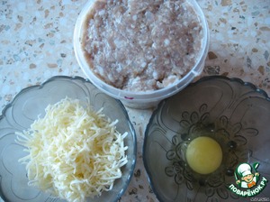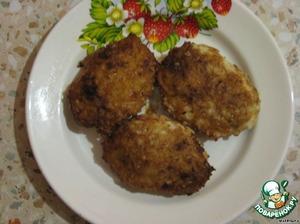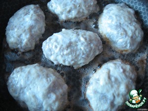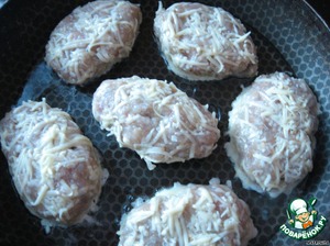 • Лепим котлетки, обмакиваем в яйце, затем в сыре, затем снова в яйца, выкладываем на сковородку.
