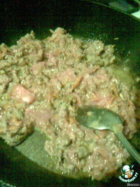 К зажарке добавить фарш и обжарить все вместе. Добавить соль, перец.