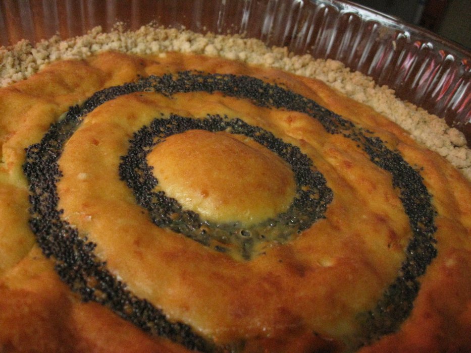 3. Для маковой начинки вскипятить молоко с сахаром. Смешать с маком и дать постоять. Добавить яйцо и сухари. Выложить массу в кондитерский мешок и выложить 2 кольца в промежутках между творожными кольцами.