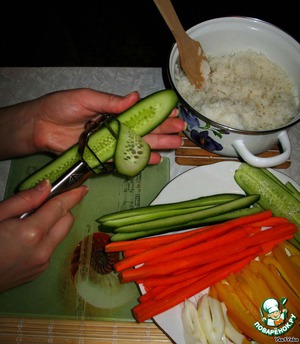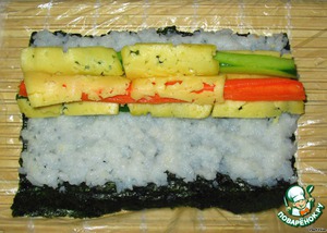 Смазываем рис тонким слоем васаби и укладываем поочередно бруски моркови (сырой) и огурца.
