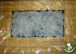 Тонким слоем выкладываем рис (руки смачиваем в воде) на всю поверхность нори.