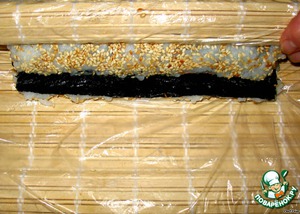 Еще один вариант на любителя: ЦЕЛЫЙ лист нори кладем гладкой стороной вниз и выкладываем рис таким образом, чтобы осталась чистая полоска нори (1,5 см.).