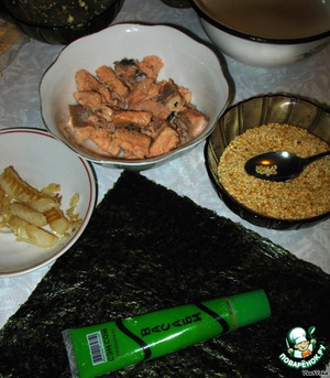 Обжариваем филе минтая, обжариваем кунжут (без масла), открываем банку горбуши. На картинке еще листья нори и васаби.