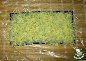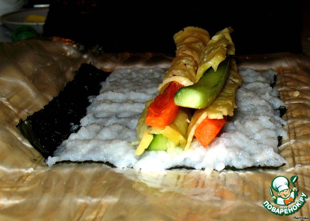 • Другой ролл: вместо кунжута посыпаем рис яичным желтком и придавливаем желток вилкой.