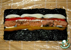 • Еще один вариант на любителя: ЦЕЛЫЙ лист нори кладем гладкой стороной вниз и выкладываем рис таким образом, чтобы осталась чистая полоска нори (1,5 см.).