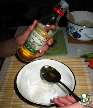 Насыпаем в эмалированную миску соль и сахар, наливаем 2 ст. л. рисового уксуса и ставим на медленный огонь до полного растворения сахара и соли.