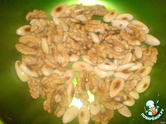 • Вспоминаем про наш миндаль. Итак, очищаем и бросаем на раскаленную сковороду на 3-5 минут (масла никакого не добавляем). В блендере перемалываем миндальные и грецкие орешки.