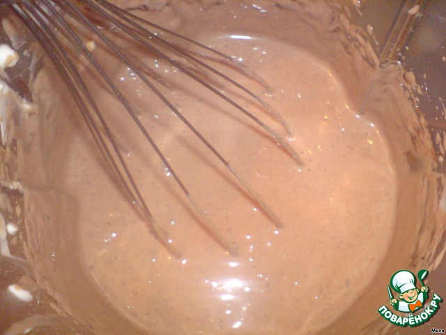 • Готовим крем: шоколад я предварительно растопила в микроволновке (2 минуты), можно сделать тоже самое на водяной бане. Смешать творог, сгущенку и шоколад.