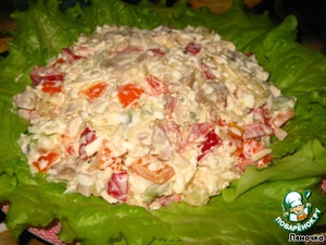 • Заправить салат майонезом со сметаной, либо только майонезом, и выложить в виде небольшой горки на листья салата.