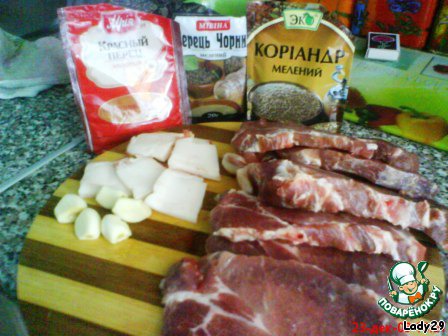 Мясо порезать вдоль волокон, сало порезать тонко. -