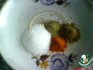 Соединить приправы и соль(я положила по пол чайной ложки приправ и чайная ложка соли), обсыпать мясо с обеих сторон и отложить на минут 15.