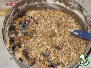 Затем добавить семечки и изюм, предварительно обваленный в муке.