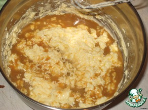 Затем добавляем теплый сливочно-чайный сироп, апельсиновый ликер (можно заменить апельсиновым соком или просто цедрой) и слегка взбиваем миксером.