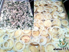 На картофель выкладываем лук, порезанный колечками, заливаем соусом и посыпаем 1 пучком порезанной зелени, и ставим в разогретую духовку на 15-20 минут.