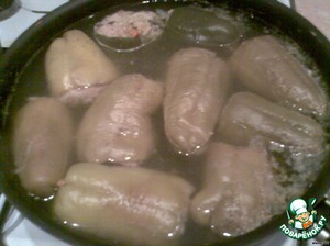 Фаршированный перчик кладём в сотейник, заливаем кипячёной, подсоленной водичкой и ставим вариться на медленный огонь. Варить 5-7 минут, после закипания, затем слить воду.