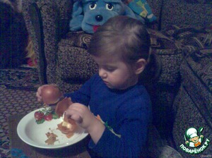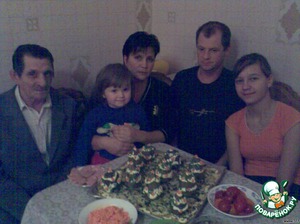 Подавать на стол с пылу с жару! МММ-вкусное семейное блюдо у нас получилось!!! И спасибо за это моим драгоценным доченькам, папуле-дедуле, моему любимому мужу, который принимал просто огромное участие в этом процессе - он хорошо кушал, но не подумайте про него плохо, он прекрасно у меня готовит, это я его пожалела, потому что Сашуля приехал после двухнедельной работы и спал, пока мы готовили ему сюрприз!!! Фоткал нас Сашин племянник, простите, уж за не очень хорошее качество, но получилось так, как получилось!!!