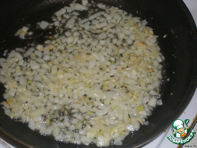 Нарежьте лук и чеснок мелко, обжарьте на смеси масел до золотистого цвета. Переложите со сковороды.