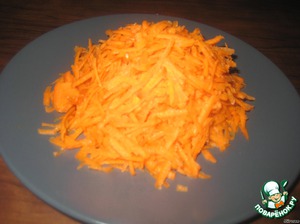 Чеснок достаем, доливаем еще 2 ст. л. раст. масла и в этом ароматном масле обжариваем мелко резаный лучок, тертую на крупной терке морковку (это уже на слабом огне).