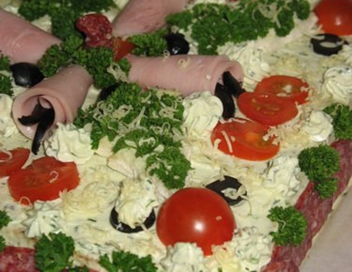 Этот небольшой закусочный тортик "В новогоднем стиле" украсит не только новогодний вечер, но и любой другой праздник в вашем доме.