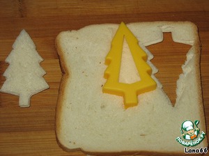 Ну а теперь полёт мыслей и ваша фантазия. Приступаем к оформлению. Чтобы придать ему новогодний мотив, я из светлого тоста вырезала формочкой ёлочки. Нанесла крема и кудрявой петрушкой изобразила ветки.