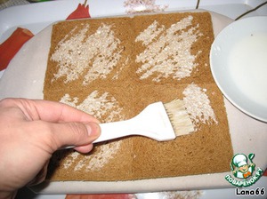 На подготовленную, обернутую пекарской бумагой, разделочную доску уложим ровно наши темные тосты. Смочим молоком. И далее каждый слой требуется увлажнить молоком.