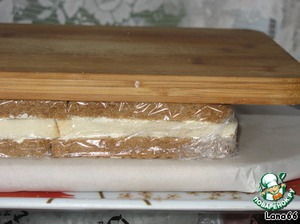 Накроем наши промазанные пласты будущего торта пищевой пленкой. Сверху положим груз и слегка придавим. В качестве груза я использовала другую разделочную доску.