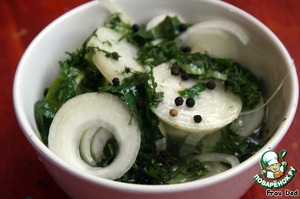 В миске смешать зелень, лук, лайм, помять руками. Влить растительное масло, добавить перец горошком.