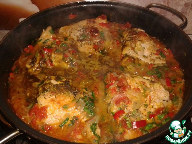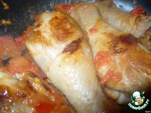 Добавить помидоры к курице и жарить 10 минут, без крышки.