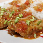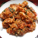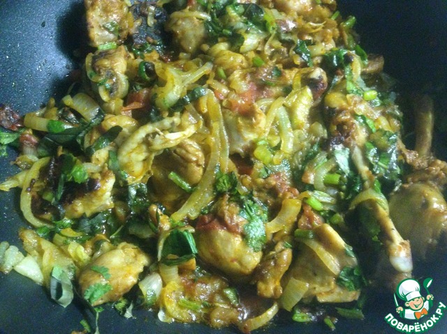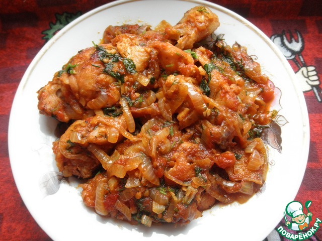 Добавить обжаренный лук к курице, накрыть крышкой и тушить на медленном огне 30 минут. Периодически перемешивать.