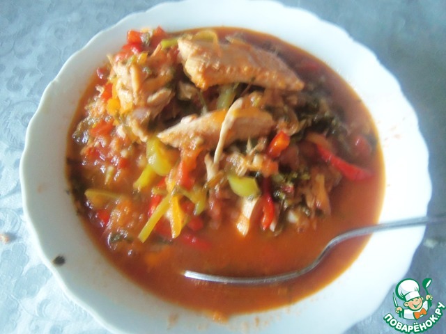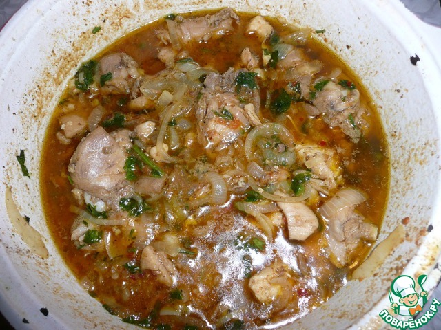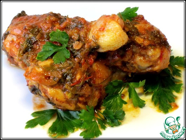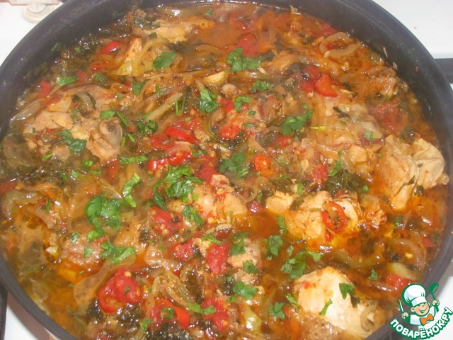 Острый перец и зелень мелко нарезать. Добавить к курице, когда она будет готова. Так же к ней добавить пропущенный через пресс чеснок, хмели-сунели и соль по вкусу. Перемешать и тушить еще 7 минут.