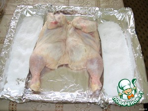 Курицу разрезать по брюшку, распластать, помыть и высушить насухо. Ничем ее не мазать и не посыпать. Положить на сухой противень. Поставить в духовой шкаф на 1 час при 180 гр. -